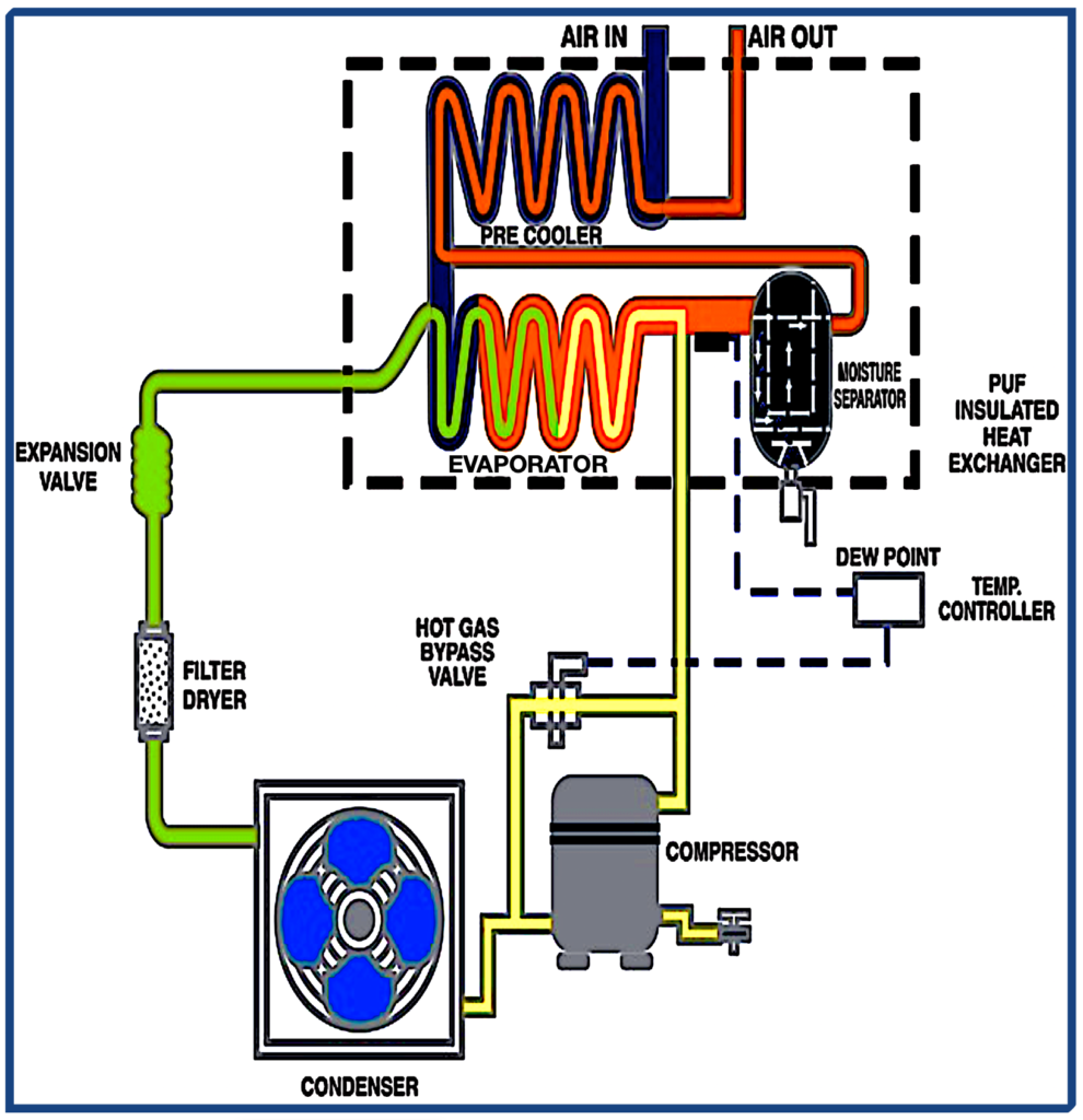 The air drying unit itself incorporates two types of heat exchangers: an air-to-air heat exchanger and a refrigerant-to-air heat exchanger, both working in harmony to optimize moisture removal.